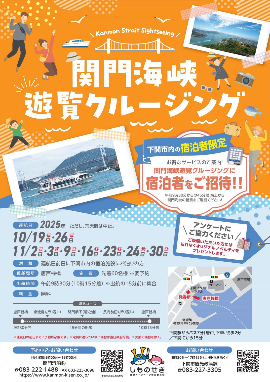 唐戸桟橋→巌流島(折返し)→関門橋下(壇之浦)→長府前田(折返し)→唐戸桟橋 〇対象:運行日前日に下関市内の宿泊施設にお泊りの方 〇定員:先着60名様 ※要予約 |